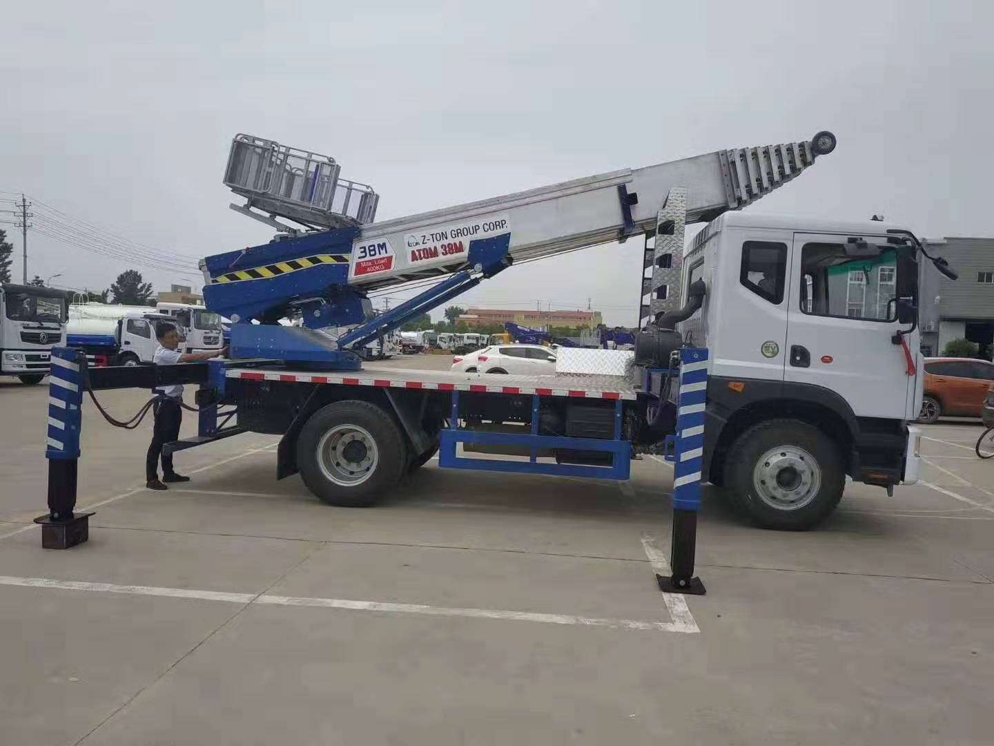 我公司生產(chǎn)的38米高空作業(yè)云梯車質(zhì)量穩(wěn)定、經(jīng)驗(yàn)豐富、技術(shù)過關(guān)。云梯采用韓國(guó)原廠整裝進(jìn)口,通過不斷完善云梯車的性能,制造出一流的高空作業(yè)云梯車,進(jìn)口液壓支腿,進(jìn)口鋁合金貨斗,進(jìn)口液壓散熱器,100米無線遙控(德國(guó)系統(tǒng)),遙控功能:1控制料斗上下、2:云梯角度遙控、3:云梯旋轉(zhuǎn)遙控、4:云梯伸縮遙控、可以加速、減速,梯臂為韓國(guó)最新技術(shù)梯臂,梯臂采用特種鋁合金,是分離模式,末端帶有滑輪。云梯搬家車的云梯單次載重400公斤,作業(yè)高度有28米、32米、38米、45米,可以用于工程租賃,幕墻施工,樓頂太陽(yáng)能、樓頂防水作業(yè),廣告高炮,電力維修,空調(diào)室外機(jī)安裝,船舶維護(hù),搬家公司,水泥沙子搬運(yùn),路橋修護(hù)等多種功能。藍(lán)色牌照,C證駕駛,無需特種操作證。非營(yíng)運(yùn)車輛,使用期限長(zhǎng)。