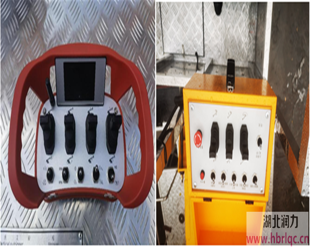 轉(zhuǎn)臺液壓手柄操作,標(biāo)配無線遙控器操作,下車液壓手柄操作,設(shè)有應(yīng)急電動液壓泵。