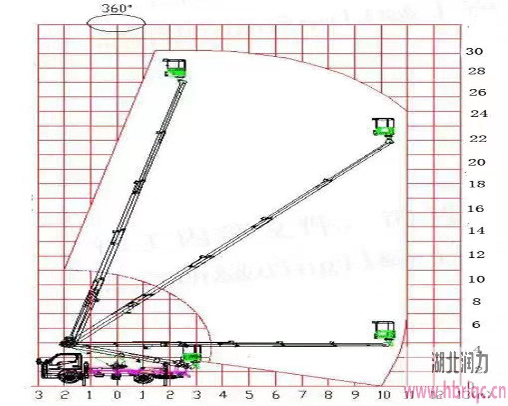 11、作業(yè)范圍圖如下圖,最大作業(yè)高度30m;最大作業(yè)幅度12m,轉(zhuǎn)臺±360°連續(xù)回轉(zhuǎn),作業(yè)斗±360°回轉(zhuǎn),可單邊作業(yè)、不伸支腿作業(yè)。